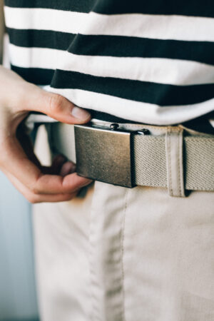 Elastisk tekstilbelte med metallspenne med Segers-logo.