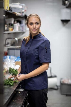 Moderne kokkejakke med kort arm med litt smalere passform til dame