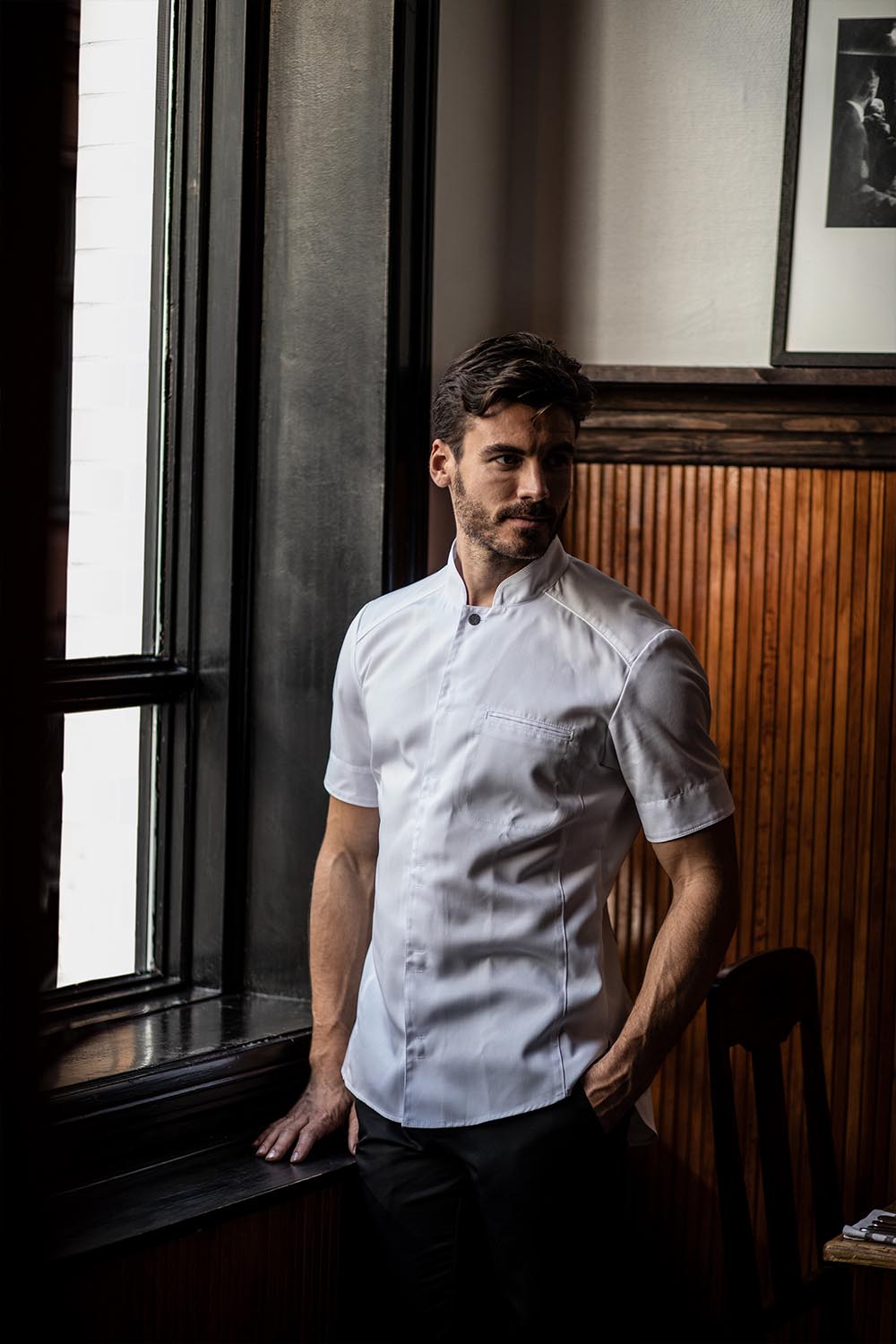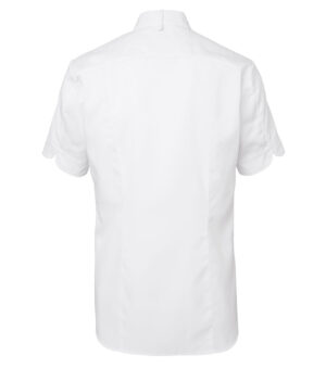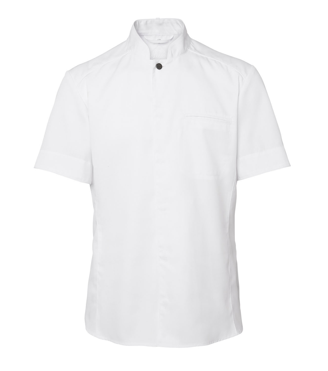 Moderne kokkejakke med kort arm med litt smalere passform til herre. Modellen er inspirert av en skjorte så den har en avrundet nederkant og er lenger bak. Produktet inngår i vår Segers Green-kolleksjon.