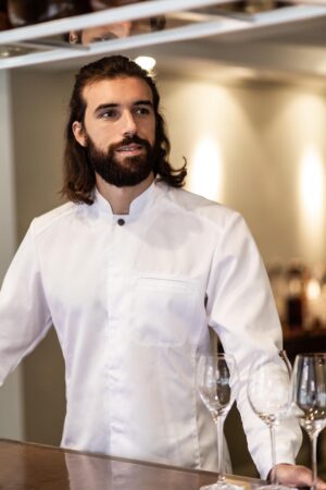 Moderne kokkejakke med lang arm med litt smalere passform til herre. Modellen er inspirert av en skjorte så den har en avrundet nederkant og er lenger bak. Produktet inngår i vår Segers Green-kolleksjon.