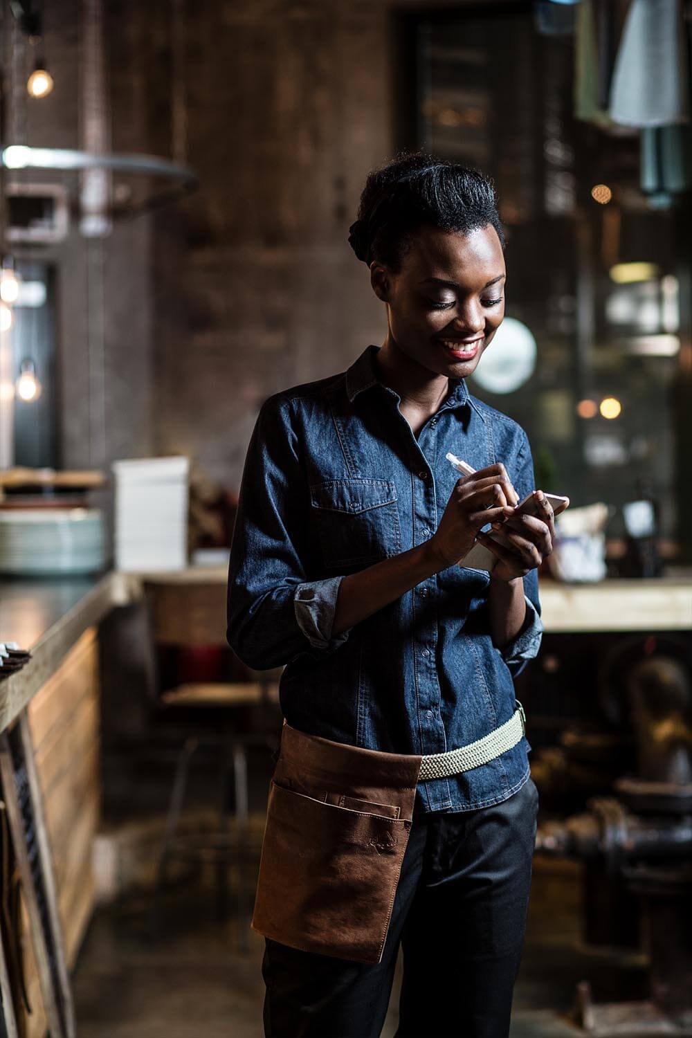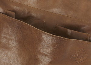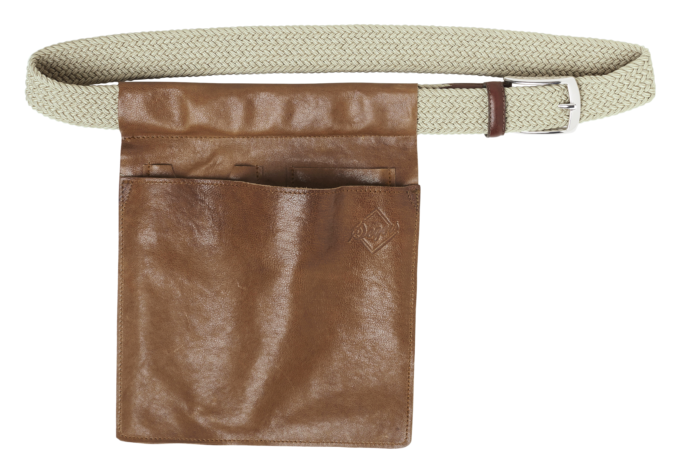 Lomme i lær som tres på beltet. Kanal, ca. 5 cm