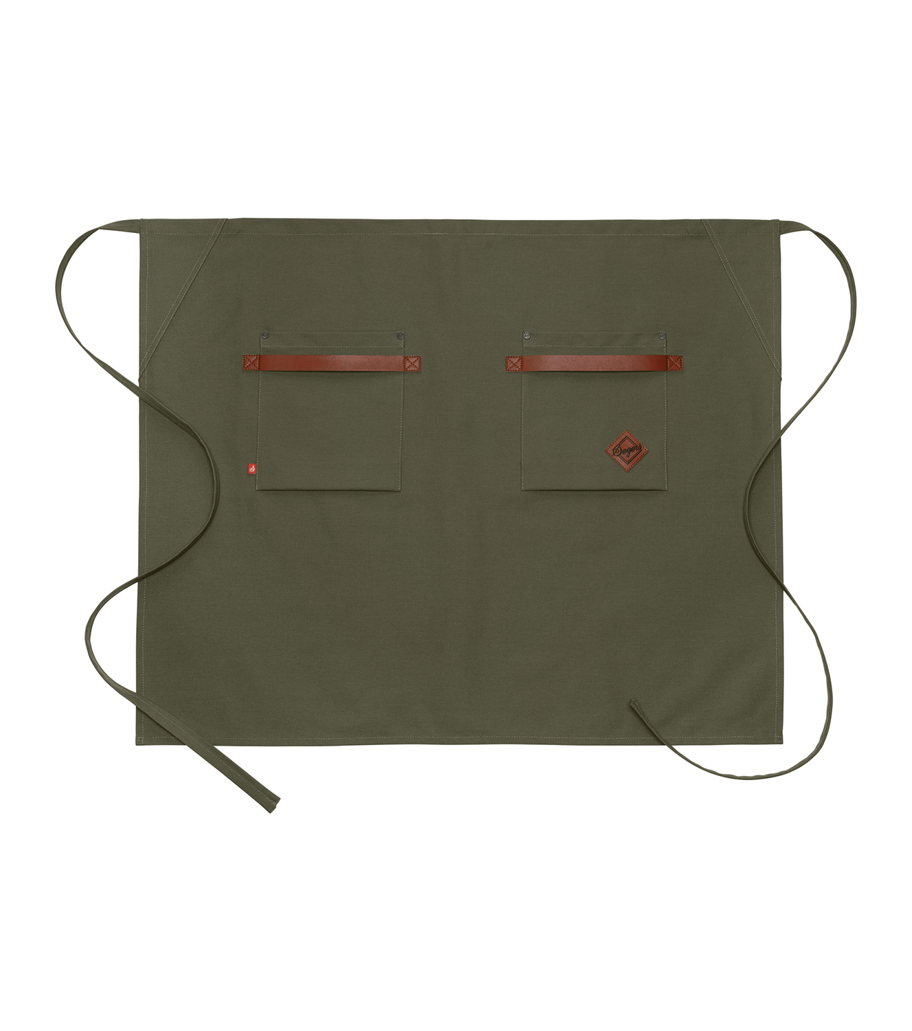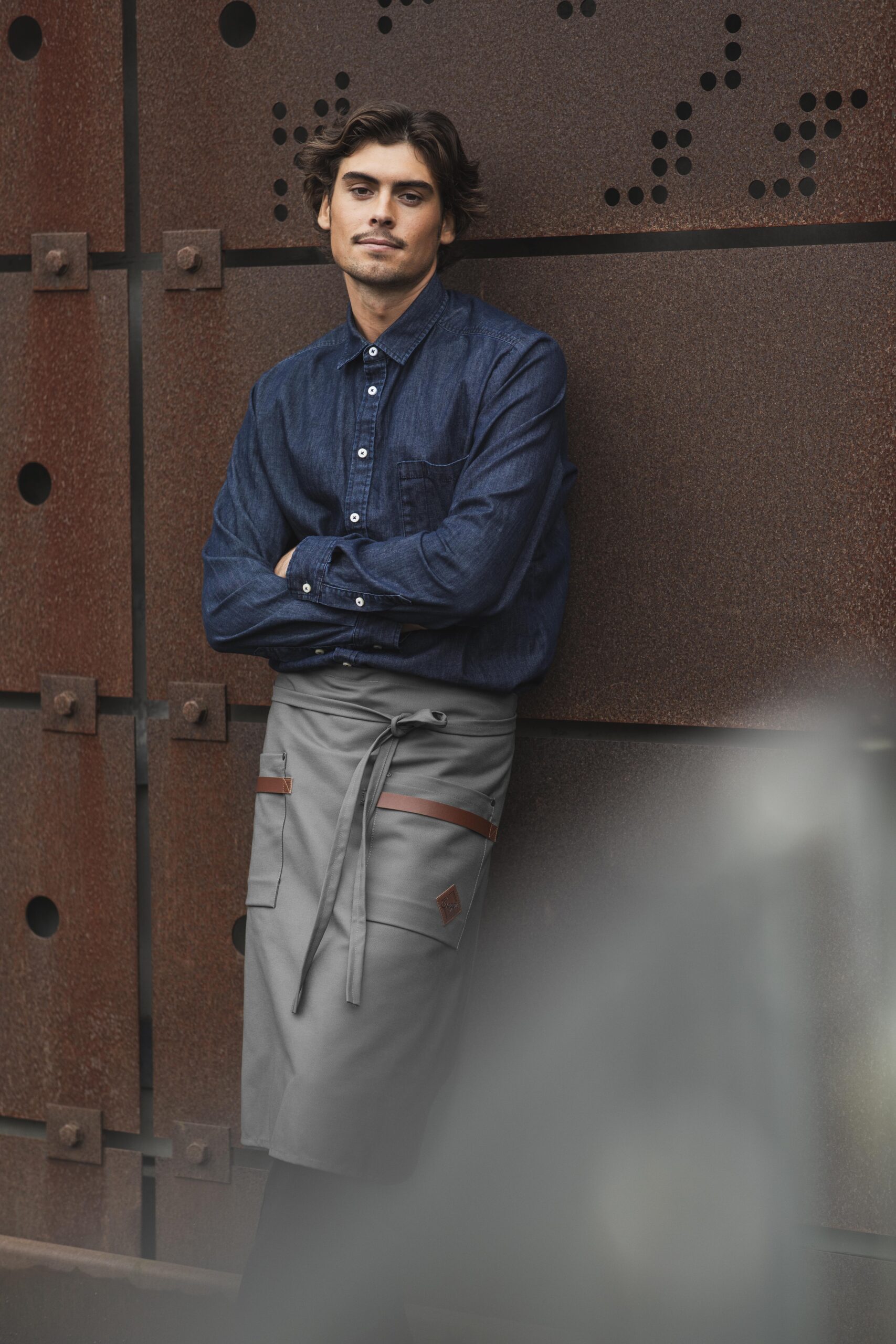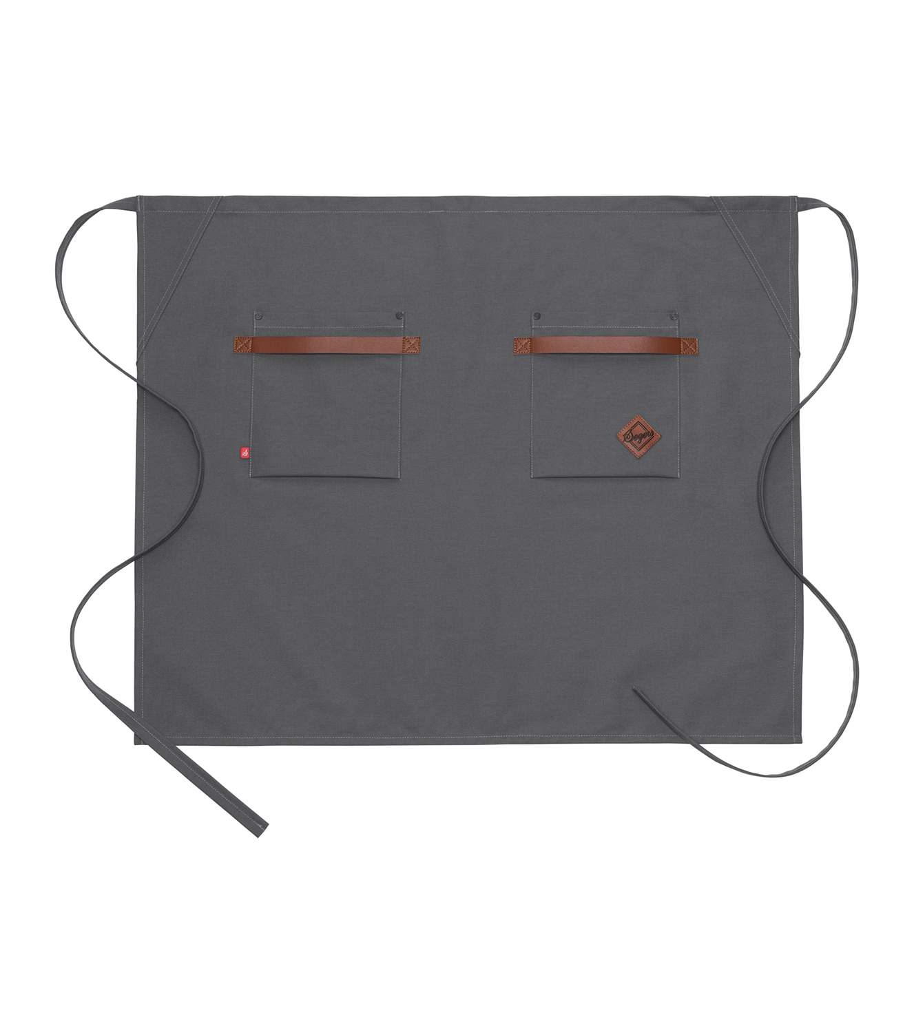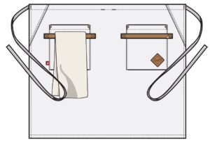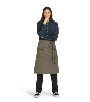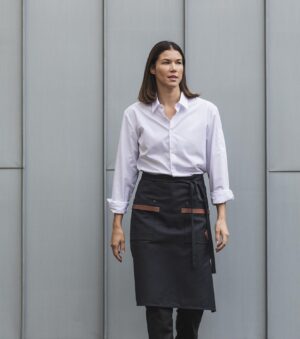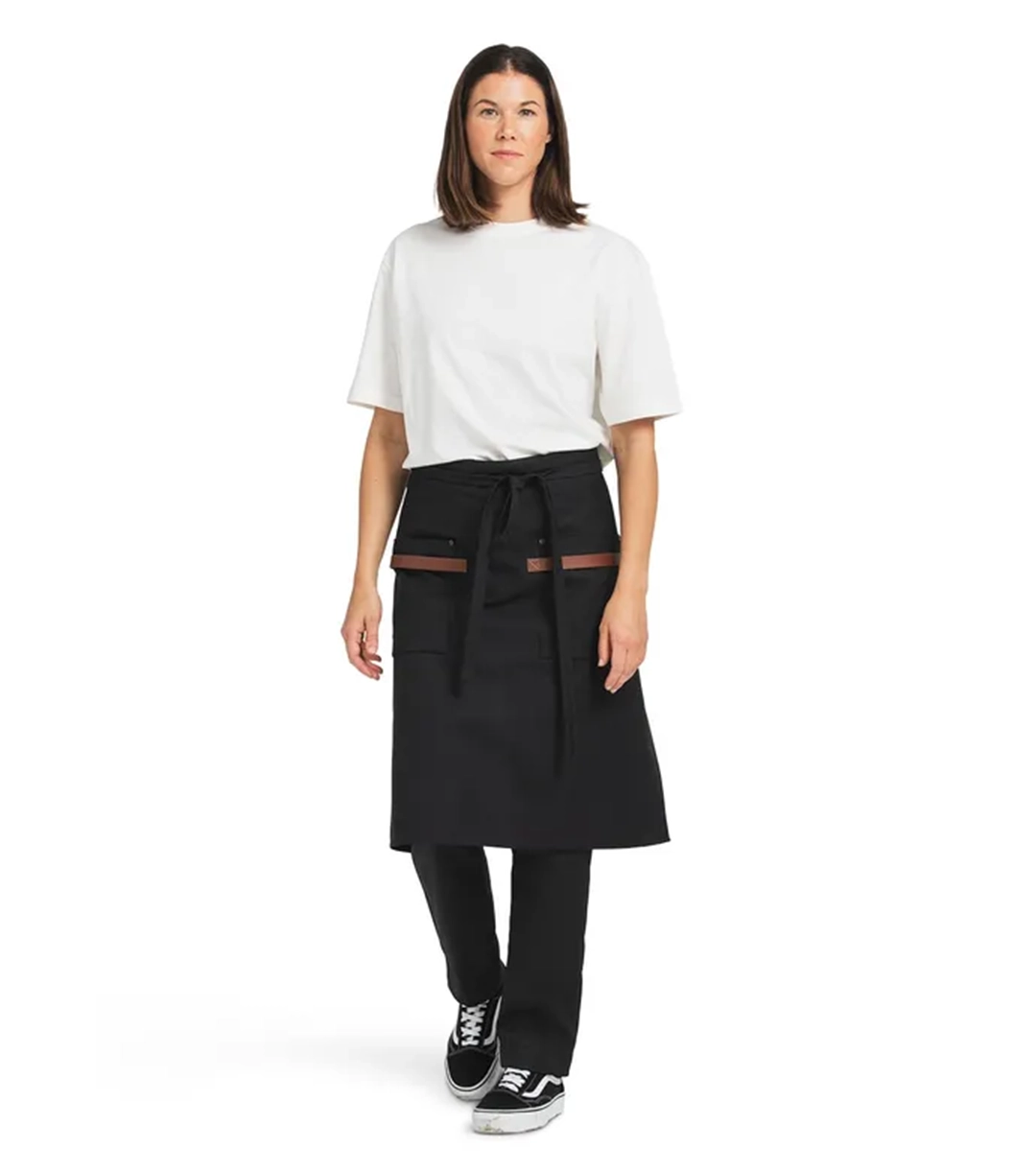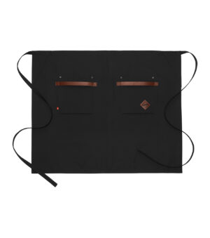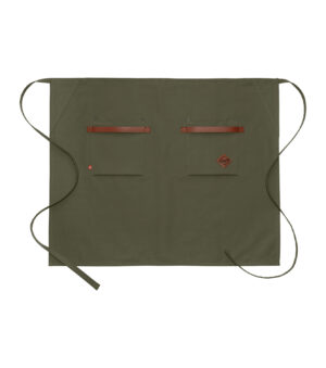 Midjeforkle i kraftig kanvasstoff. Stilige, vaskbare detaljer i kunstskinn ved de to romslige lommene. Både stilig og nyttig forkle til kjøkken/catering/bar eller andre håndverksyrker.