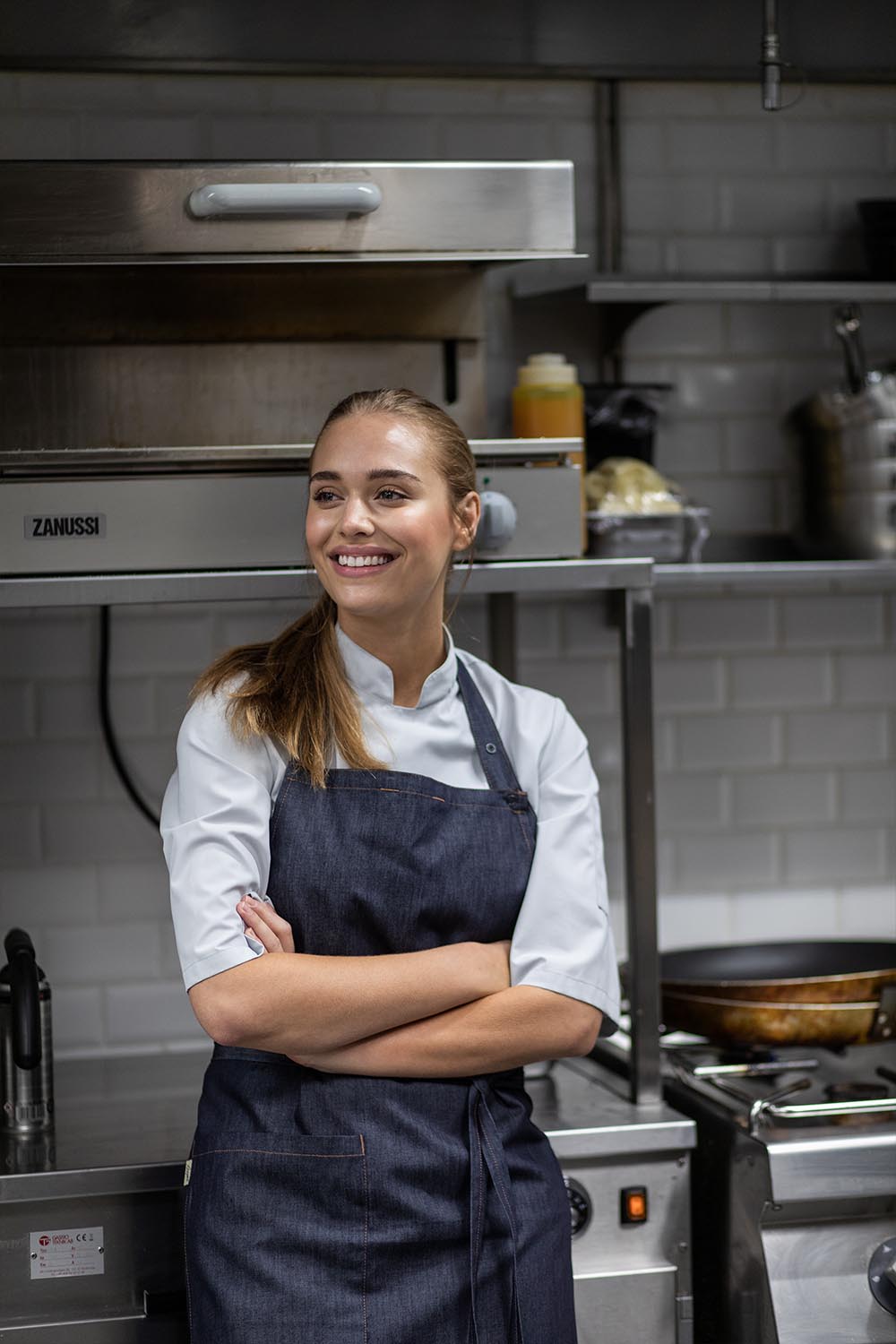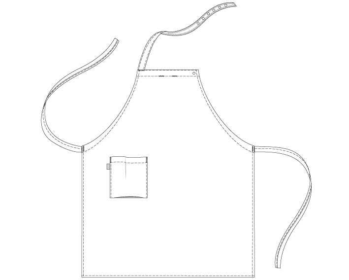 Smekkeforkle i klassisk modell med nakkebånd og romslig lomme på høyre side