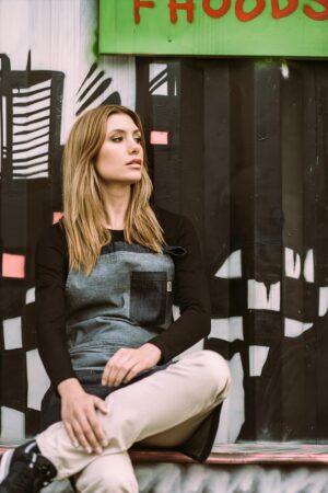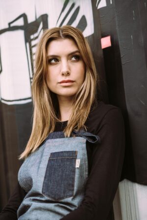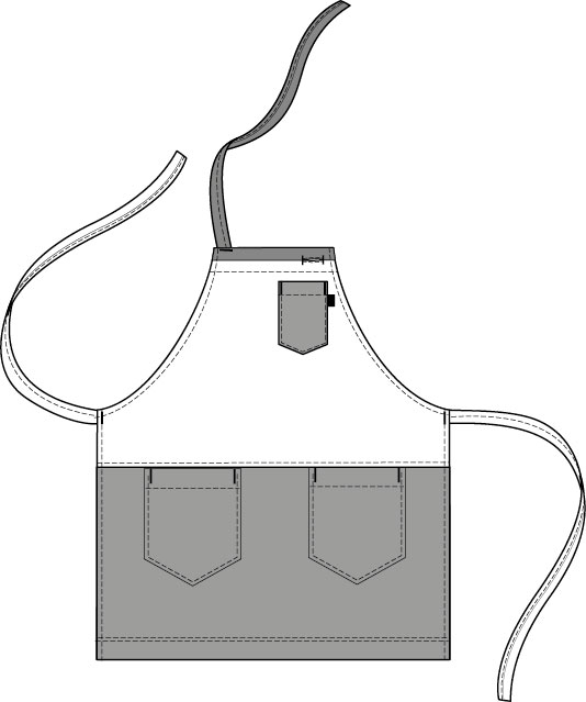 75 x 85 cm Regulerbart nakkebånd Bryst- og sidelommer Bomullsdenim